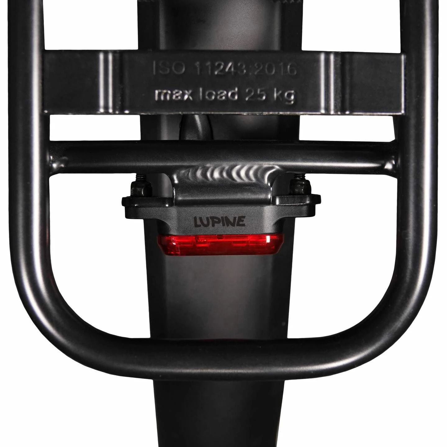 Taille minimale et visibilité maximale: telle est la promesse du Feu arrière Lupine C14 G BL pour porte-bagages de vélo électrique. Feu arrière vélo équipé de 14 LED puissantes, d’un excellent système de lentilles et d’une fonction « feu stop ». Un capteur d’accélération intégré détecte les processus de freinage et fait s’éclairer brièvement le feu arrière Lupine C14. Vous êtes ainsi encore plus en sécurité sur votre vélo électrique. Le feu stop et le feu arrière se montent discrètement sur le porte-bagages avec entraxe 50 mm. Pour que vous puissiez compter à tout moment sur votre feu arrière, le feu arrière Lupine C14 est 100% étanche et fabriqué en aluminium usiné CNC, combiné avec du polycarbonate robuste.