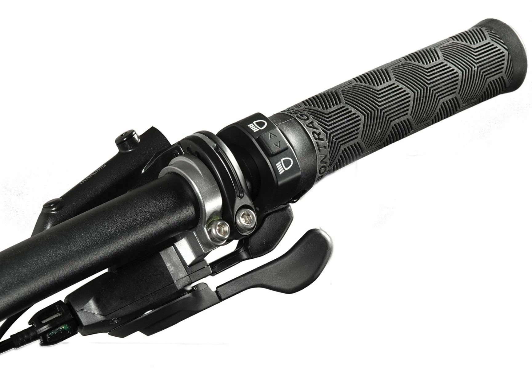 Grâce à la commande au guidon, spécialement conçue pour les vélos électriques, vous pouvez passer du feu de croisement au feu de route en quelques fractions de seconde. Pour ne pas oublier de repasser en feu de croisement lorsque vous croisez un autre usager, le symbole du bouton brille en bleu ou en vert pour vous indiquer si vous êtes en feu de croisement ou de route.