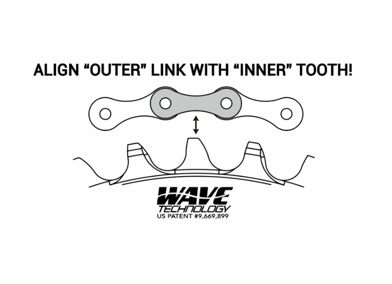 Le principe Wawe s’inspire d’une vague et propose l’alternance d’une dent orientée vers la gauche et d’une autre vers la droite. Les dents ont toutes la même forme mais sont orientées de manière à pousser alternativement chaque maillon de la chaîne de l’intérieur vers l’extérieur permettant la rétention de cette dernière. Ce profil de dent aide à réduire les frictions et laisse plus de place pour évacuer la boue et des éventuels débris.