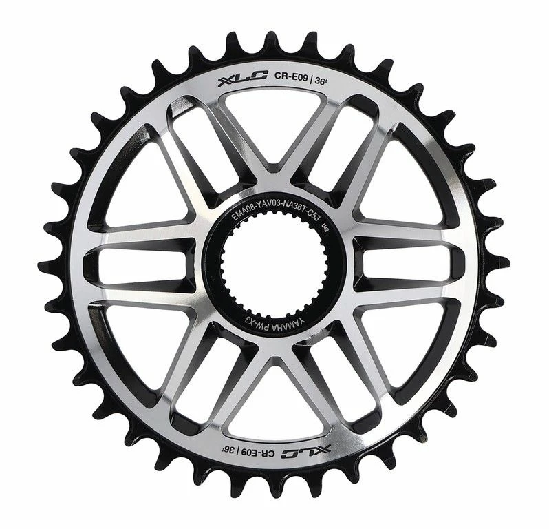 Plateau XLC CR-E09 usiné CNC pour les vélos électriques avec moteur Yamaha PW-X3. Plateau Direct Mount en alliage d’aluminium. Disponible en 36 ou 38 dents.